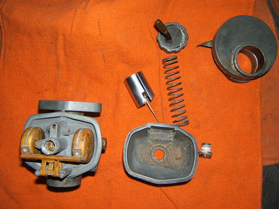 このキャブを補修しても良いのですが、それでは面白く無いので、何か違うキャブを取り付けてみたいと思います。問題はキャブの口径です。本体の大きさから比べて口径が22mmぐらいしか有りません。今時なら50~80cc用でしょうか?確かカワサキの250SS 3気筒の1個が22mmだった様な?
