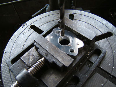 右上の型紙、赤丸がメグロ用内径22mm外側黒丸がVM用26mm この型紙に合わせてベークライトのインシュレーターと同じ厚さの10mm厚のアルミ板よりベースを切り出します。(気前良く7075材を使ってしまいました。と言ってもキャリパーサポートなどを作るために在庫をしておいたものですが、)