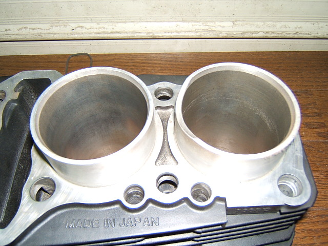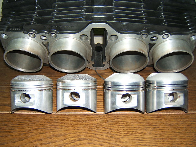 KZ1000 S1ワークスのアルミシリンダーとピストンです。シリンダーライナーが線爆溶射のアルミ製でノーマルS1のシリンダーより1Kg軽量化されています。ヘッドガスケットは2重構造でライナー側にも1枚入ります。ピストンはノーマルとハイコンプ仕様です。ピストンヘッドが少し高くなっています。ボアは70mmで総排気量1.015cc。多分当時のレギュレーション、ギリギリのボアなのでしょうか?