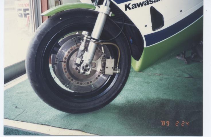 16インチダイマグ、フォーク下端にはエキセン、油圧アンチダイブにフルフローティングキャリパー、短いトルクアームが見えます。