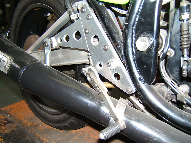製作したプレートをフレームに当てて見ると、取り付け位置が全く違うのが、解ります。無理にノーマル穴を利用して付けようとすると位置が変わり更に、内側に入ってしまうので、マスターもスイングアームに当たってしまいます。では、どうすれば、ノーマル穴を使い、更に外側に出すか?それにはノーマルフレームに合わせた取り付けステーを製作すれば、OKです。厚さ10~15mm、幅20mm長さは適当に、ぐらいのアルミ角材を使ってノーマルフレームに取り付けます。この時取り付けボルトは沈み穴にします。(このステーの上にステッププレートが乗るため)ステーの取り付けが出来たらこの上に製作したプレートを当て位置決めをしてステーにネジ切りをすれば完成です。ステーの上下部のはみ出しは、プレートに合わせ切り取ります。後はステップバーとブレーキペダルは好みの物をチョイスして取り付けて下さい。本物はパイプを溶接しただけのシンプルな物でした。パクリ号は取って置きのKR350用純正品を奢りました。チェンジ側も作りはブレーキ側といっしよですが、取り付けステーが見えてしまいますので、大きく作っています。ペダルはレイニー号と同じにすると、逆チェンジになってしまいますので、ペダルのロッド取り付け部を上側にします。しかし、余り上側にするとチェンジロットがスイングアームナットに当たってしまいますので、適当な高さで、、、、