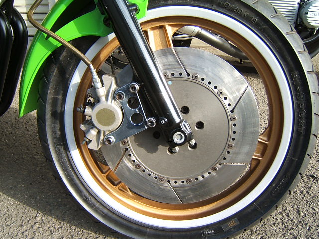 デスクプレートは左右共通ですが、インナーはベアリングの取り付け方法が異なるため右と左では別部品となっています。キャリパーはトキコ製マグ2ポット、KZ1000 S1と同じ物です。(若干のデザインの違いとピストンの径は数種類有る様です)